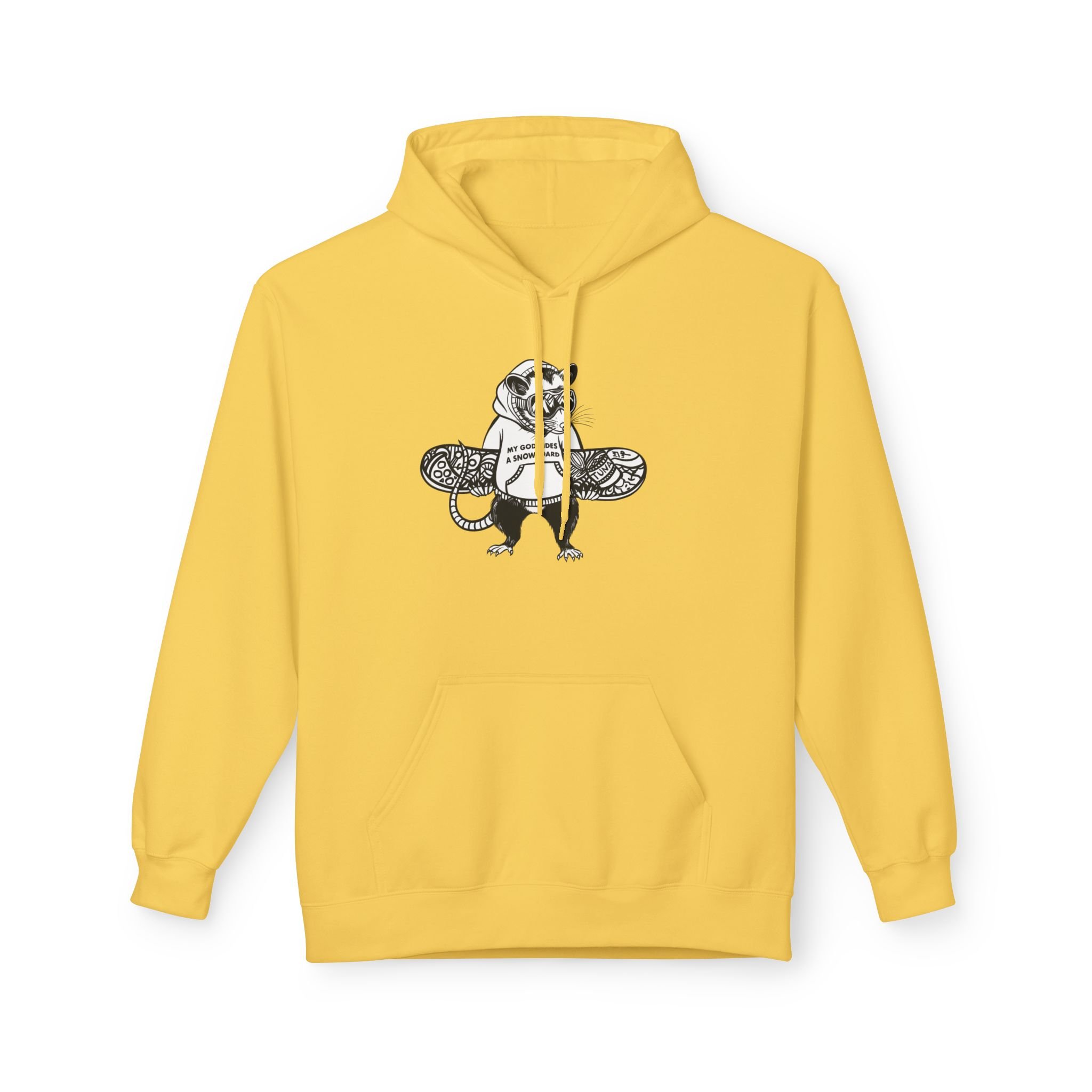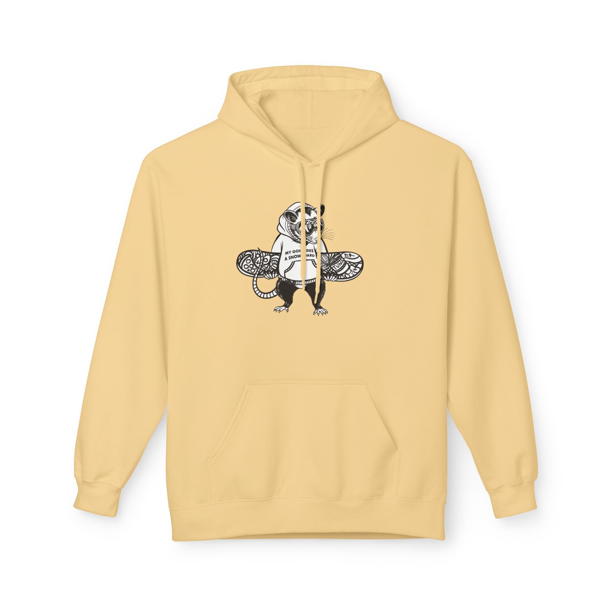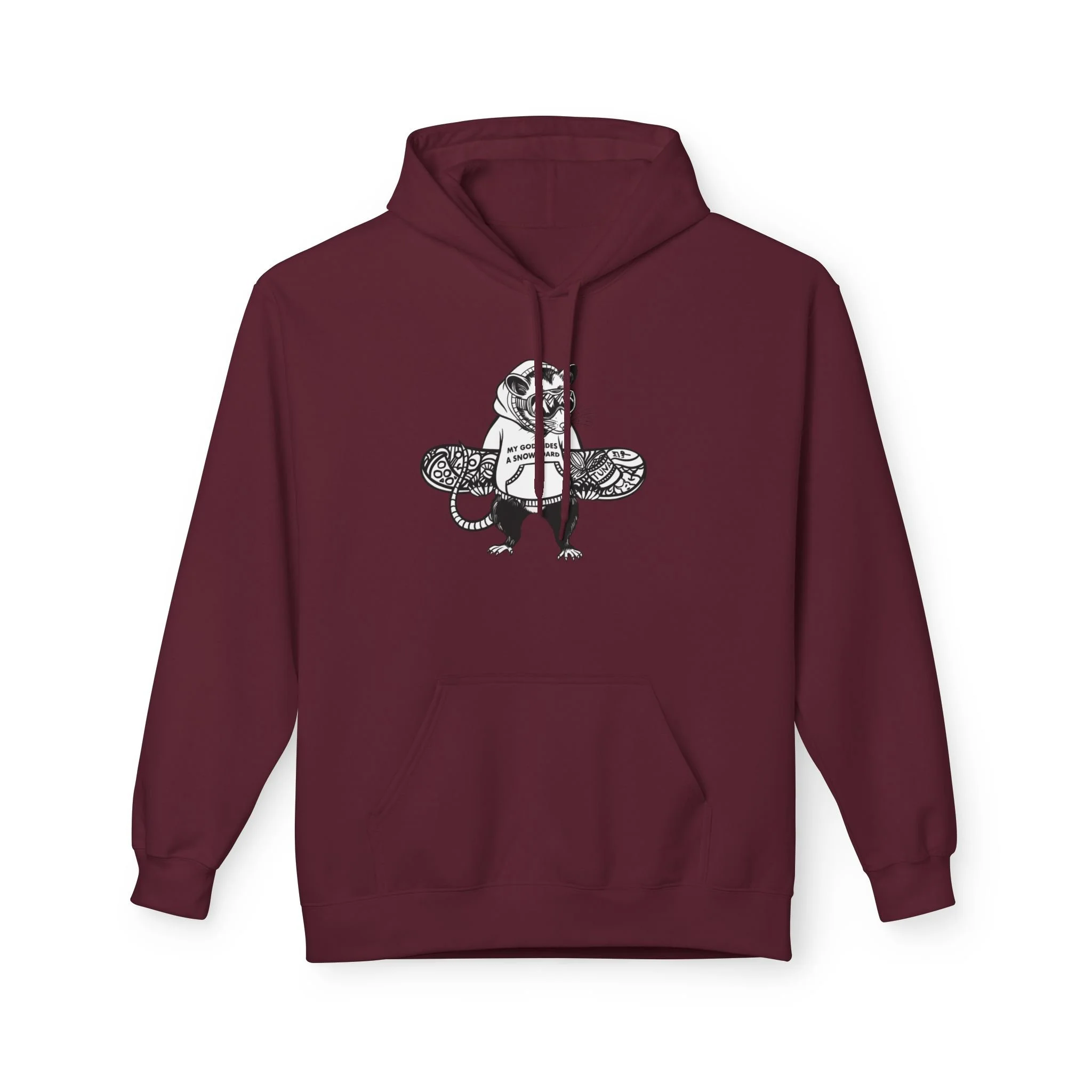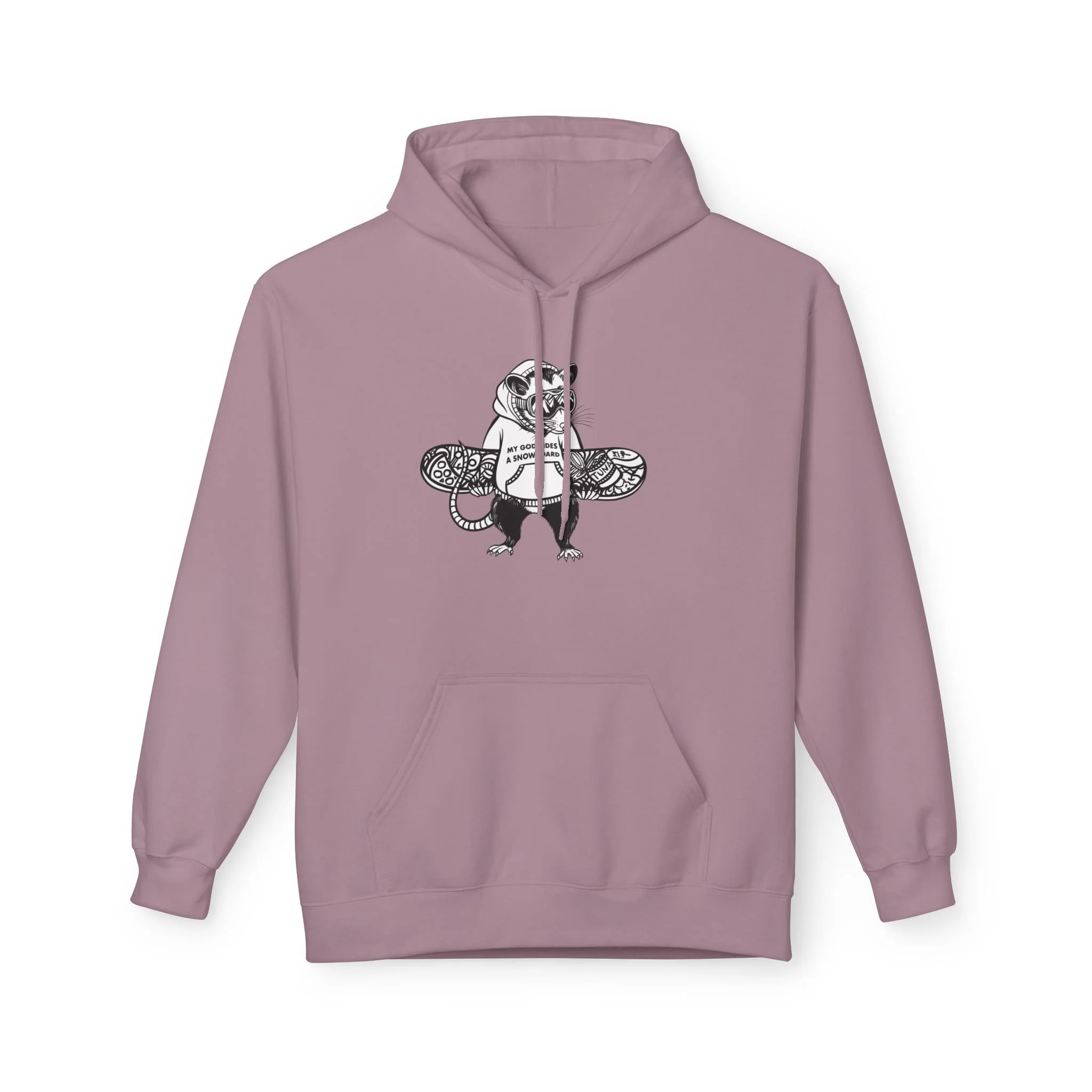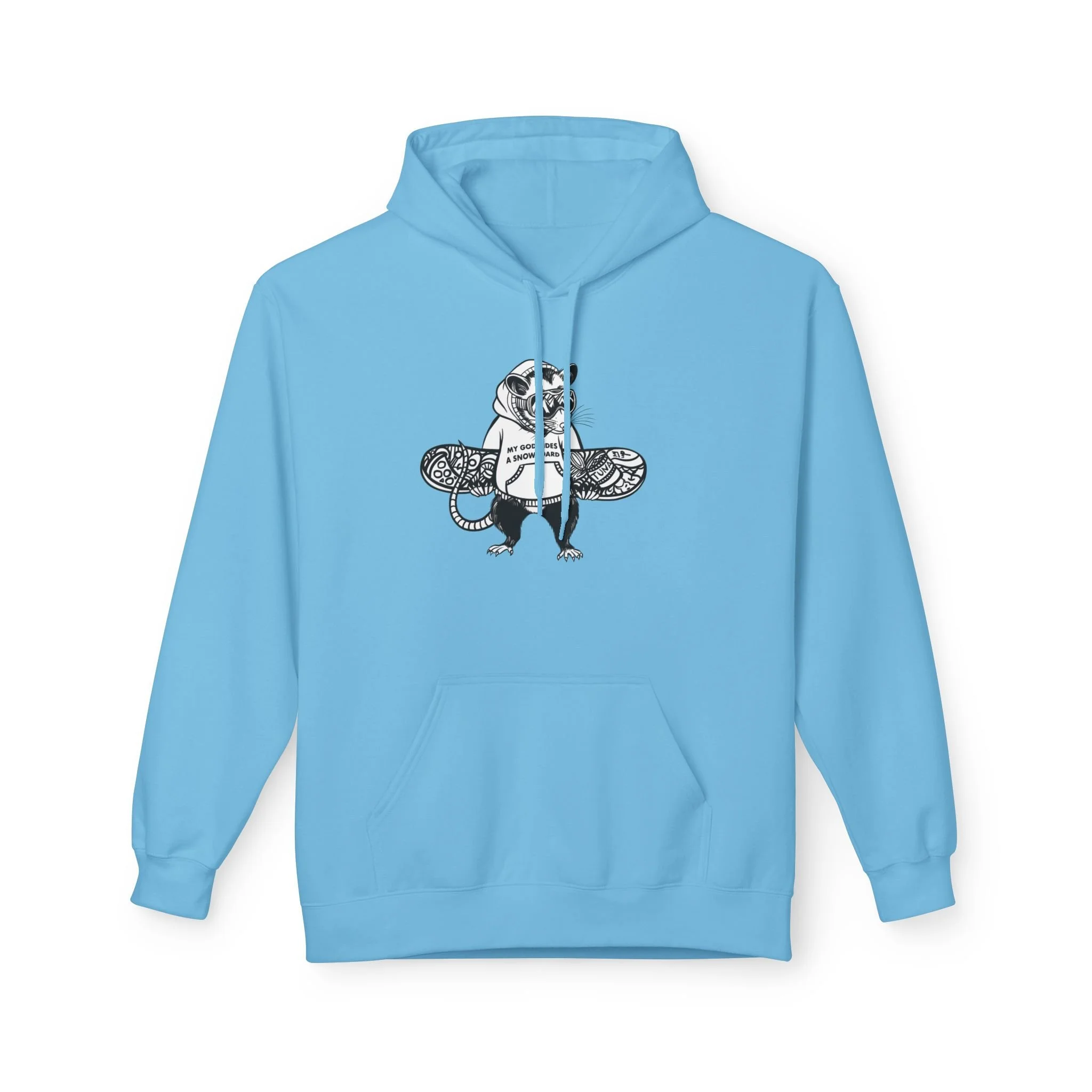 My husband is obsessed with snowboarding, and one day he asked me to design a hoodie for him with the phrase “my god rides a snowboard.” I didn’t want to make something generic, so I turned it into a real illustration — a funny opossum in a hoodie, carrying his snowboard (covered in his favorite opossum snacks, of course).